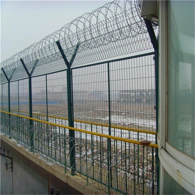 2. 高戒备场所隔离网表面工艺:防腐处理,耐老化,耐酸碱,不褪色;刀刺铁丝网的布置密度不小于10圈/米,每相邻一个圈的间距不大于100mm,高戒备场所隔离网的材料是304不锈钢。